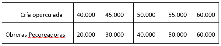 • La proporción entre la cría operculada y la población adulta disminuye ente un 10% y un 14% por cada incremento de 10.000 abejas. Una colmena fuerte puede tener una relación de una abeja adulta por larva, mientras que una colmena pequeña tiene una relación de 2 larvas por abeja adulta.