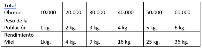 • En condiciones adecuadas de flujos nectaríferos, la cantidad de miel potencial que puede producir una colmena (producción de miel) tendría que ser igual al cuadrado de los kg, de abejas que tiene en ese momento. Si en principio estos conceptos suenan confusos, esperamos que las siguientes aclaraciones contribuyan a su comprensión. Si consideramos que 1 kg de abejas contiene aproximadamente unas 10.000 obreras y que de un cuadro de cría bien operculado nacerán unas 5.000 obreras podemos iniciar la explicación.