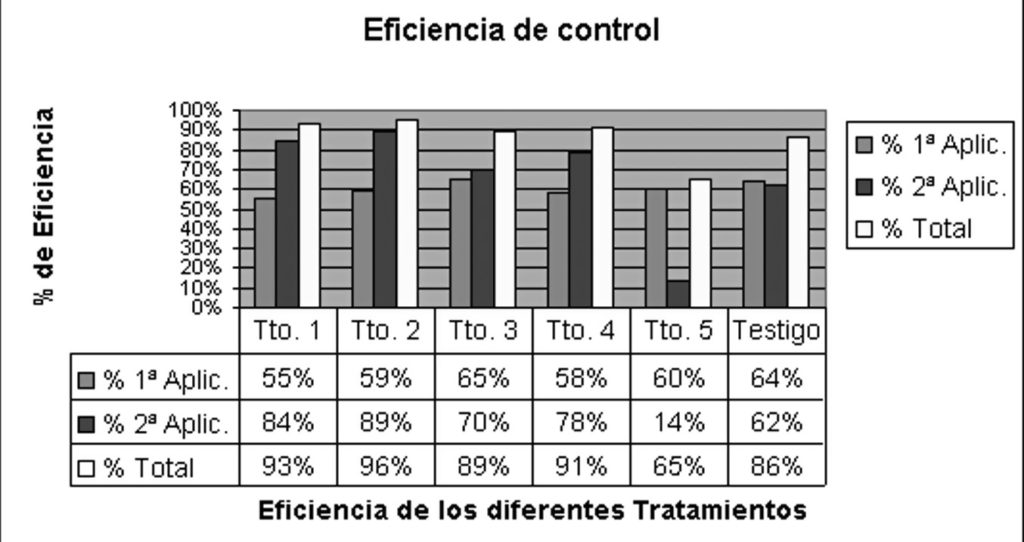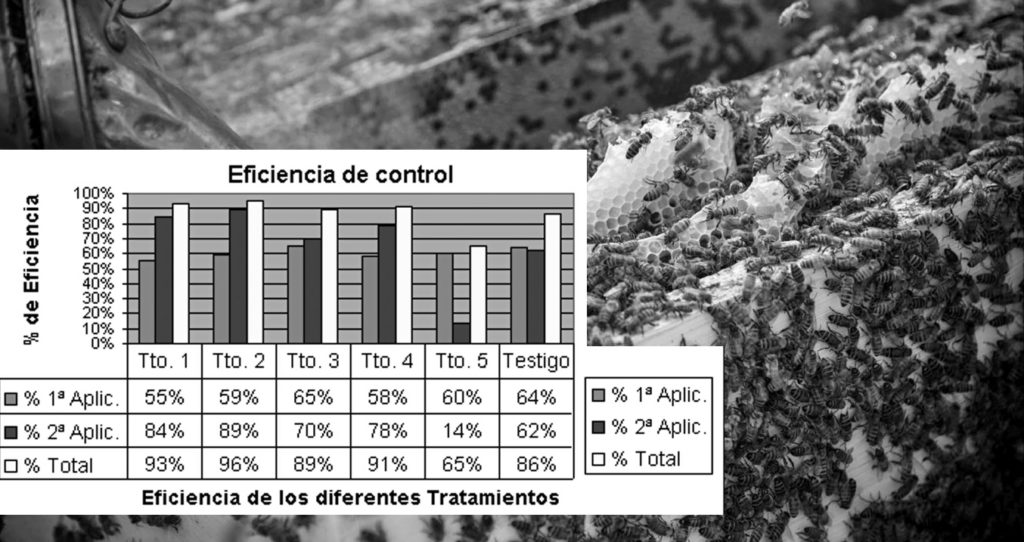 Todos los tratamientos excepto el 5 (cera antivarroa) tuvieron una eficiencia de control cercano al 90% para la carga de varroas existentes en las colmenas del ensayo.