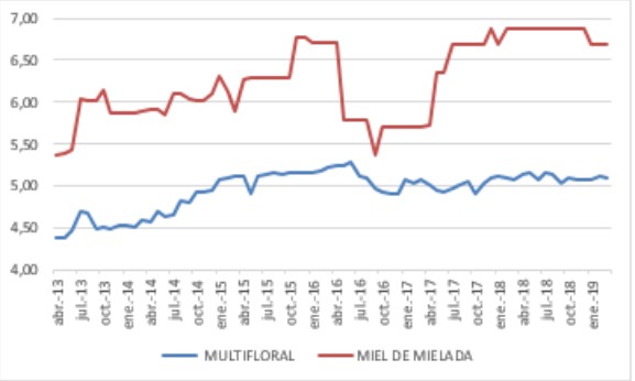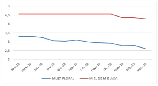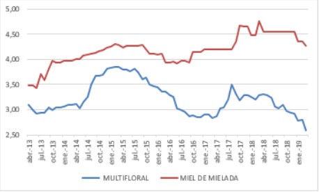 La recientemente finalizada temporada 2018/2019 dejó descensos generalizados de cotizaciones en los diferentes tipos de mieles en territorio español. Estas caídas fueron más destacadas en las mieles a granel, con valores anotados del (-21,48%) en la variedad miel multifloral y del (-6,13%) en la variedad miel de mielada, según un informe elaborado por la Subdirección de Análisis, Coordinación y Estadística del Ministerio de Agricultura, Pesca y alimentación de España.