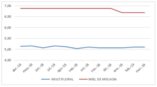 En relación a las mieles a granel, la miel de mielada mantiene la tendencia ascendente iniciada en a finales de 2016, si bien el año 2019 se inició con descensos de cotizaciones. La miel multifloral consolida la tendencia descendente de precios iniciada en julio de 2017, anotando precios mínimos de las últimas 5 campañas en marzo de 2019.