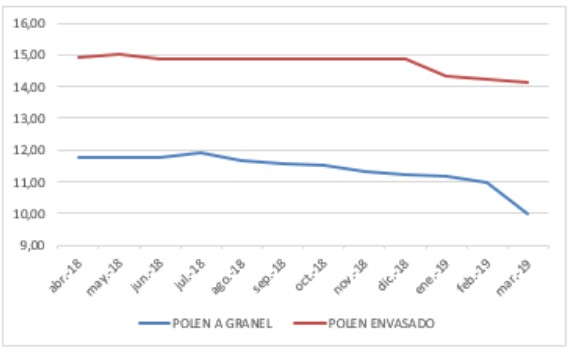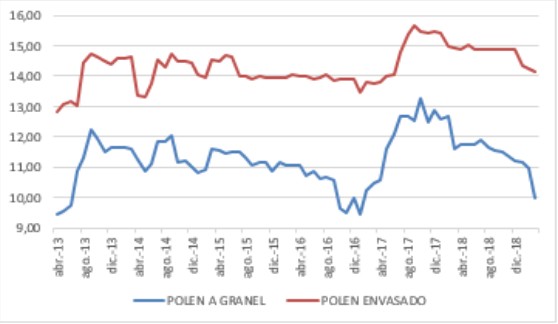 Con respecto al polen, en la campaña 2018/2019 se dio una baja del 14,88% en el comercializado a granel y -5,05% en el envasado, siempre por supuesto hablando de cotización.