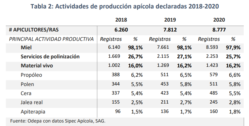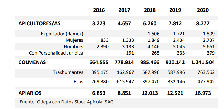 Según cifras del Sistema de Información Pecuaria (SIPEC Apícola) del Servicio Agrícola y Ganadero (SAG), a septiembre del año 2020 se registraron 8.777 apicultores y apicultoras, 12,4% más respecto al año 2019. Este universo se caracteriza por concentrar a pequeños productores que representan a la agricultura familiar campesina, donde el 21% de los apicultores/as registrados señala ser exportador, 4,3% posee personalidad jurídica y 31% corresponde a mujeres apicultoras.