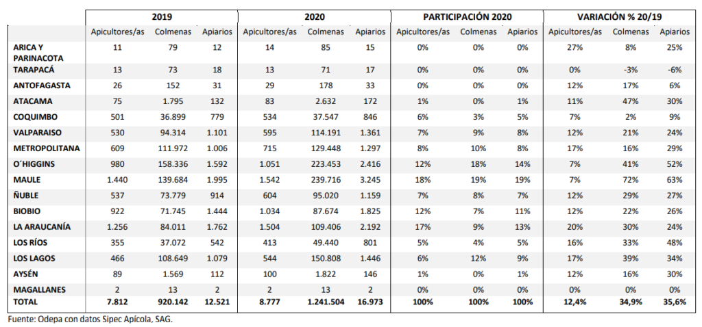 Respecto a las existencias de colmenas en 2020, las regiones que destacan en participación a nivel nacional corresponden a Maule (19%), O´Higgins (18%) y Los Lagos (12%). Lo mismo ocurre en las existencias de apiarios, donde las regiones del Maule y O´Higgins agrupan el 19% y 14% respectivamente; seguidas de la región de la Araucanía con el 12% de los apiarios a nivel nacional.