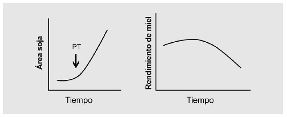 Los datos son concretos e indican que en los años donde es mayor la superficie sembrada de soja, disminuye la producción de miel. “Encontramos un punto en el cual cambia la tendencia, que es en el 75 y 95. Hay un cambio en la superficie cosechada, la cual es mayor y en la producción de miel observamos un cambio descendente desde 1997”, profundizó.