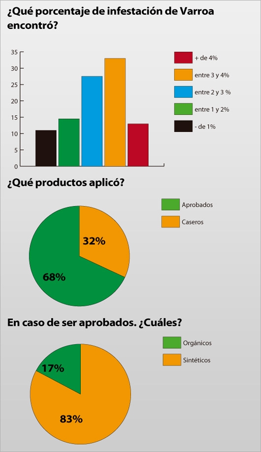 Por otra parte, es importante señalar que la mayoría de las aplicaciones sanitarias fueron con productos sintéticos aprobados, aunque más del 30 por ciento de los apicultores se inclinaron por el uso de productos caseros.