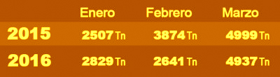 Si tomamos como referencia el primer trimestre del año pasado, las cifras son muy parecidas y en ambos casos el volumen exportado oscila las 11 mil toneladas, consolidándose Marzo como el período de mayores ventas.