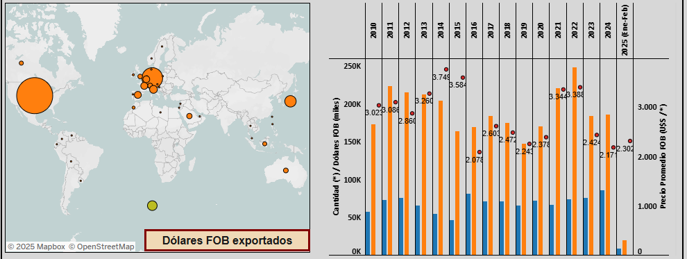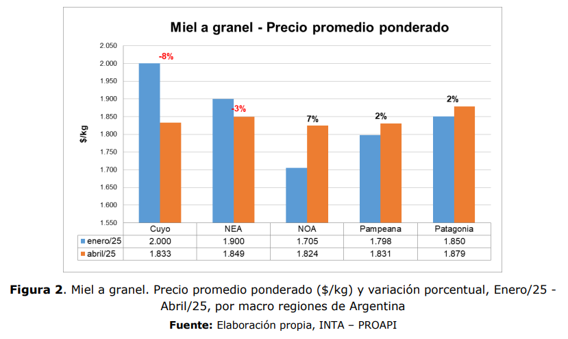 Comparando los precios promedios ponderados de la miel a granel con destino a exportación (sin discriminar por color) por macro regiones de Argentina entre enero/25 y abril/25, a valores corrientes, se observa en la Figura 2 un aumento de los precios en las macro regiones NOA, Pampeana y Patagonia, en cambio, en Cuyo y NEA se registró una disminución.