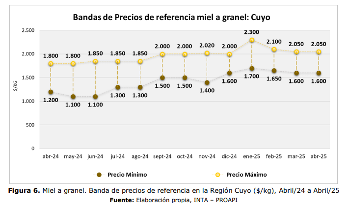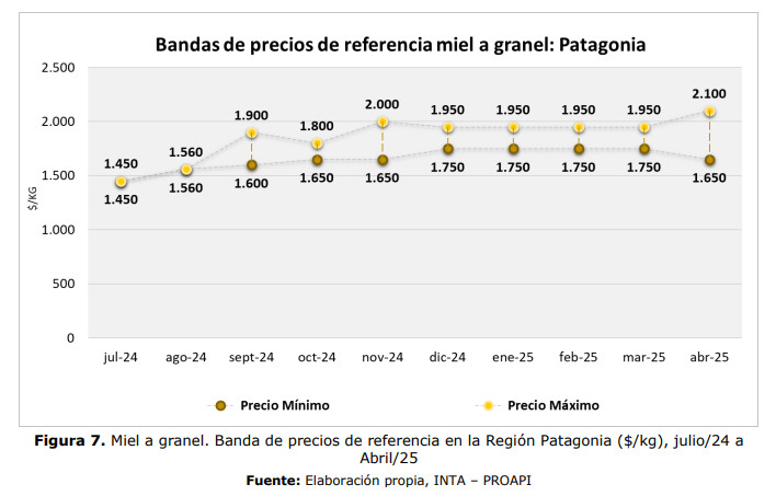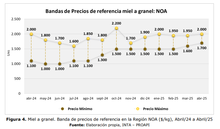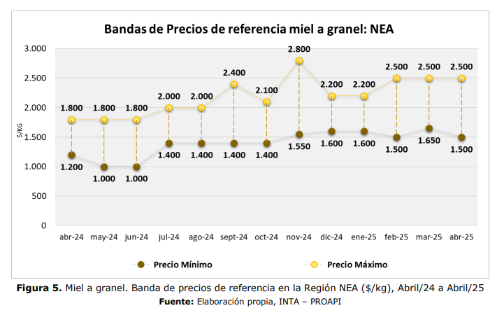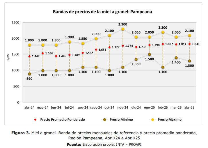 El Programa Nacional Apícola de INTA (PROAPI), a través de la Red de Unidades Demostrativas Apícolas (RIST-I025), realizó un relevamiento con el objetivo de proporcionar a los actores de la cadena apícola información actualizada sobre los precios de referencia de la miel en Argentina. Este relevamiento se realizó durante los primeros diez días de abril de 2025 y contó con la colaboración de un equipo de informantes calificados de las diversas regiones de la República Argentina. La información relevada se caracteriza por no diferenciarse por calidad, tipo de miel o característica de la operación, no reflejando así la economía de una empresa en particular, sino, más bien, actuando como patrón referencial del mercado interno de miel. Los precios de referencia1 son formados a partir de los valores que resultan habituales o frecuentes para los compradores o consumidores, y los expresamos a través de bandas de precios. El objetivo de las bandas de precios es brindar un rango de precios aproximado, indicador que muestra las oscilaciones de los precios de la miel en 3 líneas: una de ellas es la media móvil y las otras 2 se construyen con los valores máximos y mínimos (López Medina, 2022). Se informan los precios de la miel a granel recibidos por el productor, con destino a la exportación en tambor, o a mercado interno; esta última, se divide en la miel a granel comercializada entre productores para fraccionado o en envases menores de 20 a 30 kg como particularidad. Además, se detallan los precios de la miel fraccionada en tres formas diferentes: minorista, feria y supermercado.