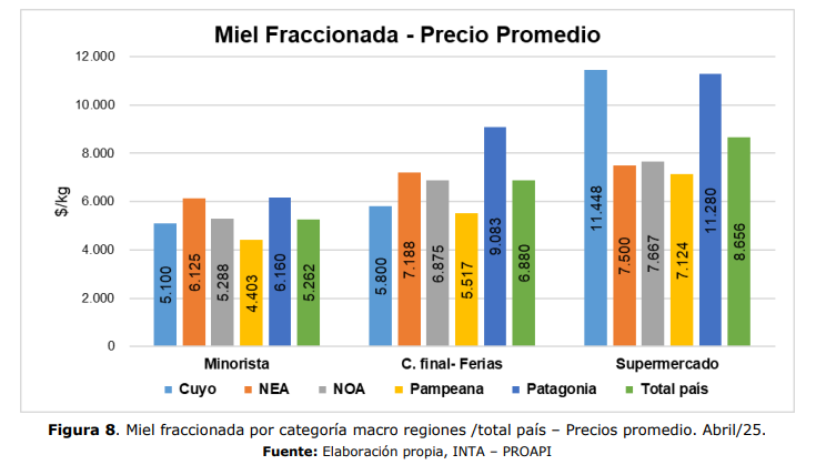 En la Figura 8 se muestran los precios promedios de las tres categorías de miel fraccionada relevadas para el cada una de las macro regiones y total nacional para el mes de abril/25.