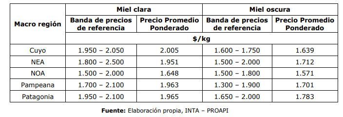Tabla 1. Miel a granel exportación por color. Rango de precios de referencia relevados y precio promedio ponderado por macro regiones de Argentina ($/kg), abril/25
