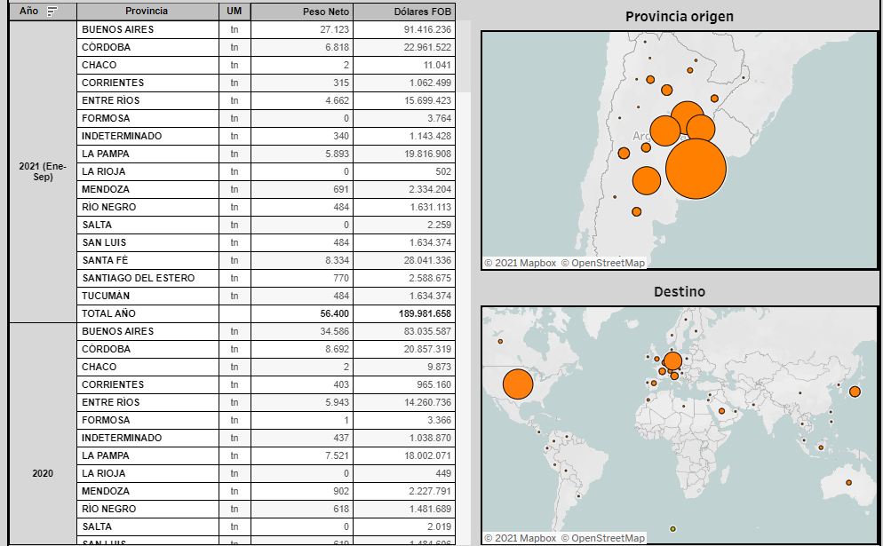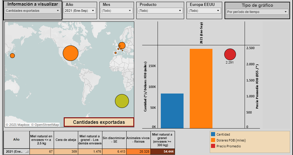 El complejo miel exportó 124 millones de dólares en el primer semestre de 2021 (0,4% de las exportaciones totales argentinas) y registró un crecimiento interanual de 26,5%. Del total exportado, el 98,4% se concentró en miel natural, mientras que el resto se repartió entre cera de abeja y abejas. Entre los principales destinos se pueden mencionar USMCA (85 millones de dólares, con una participación de Estados Unidos de 98,8%), Unión Europea (22 millones de dólares) y Japón (12 millones de dólares).