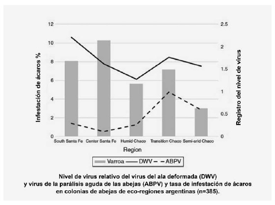 Se examinaron las ecorregiones argentinas para evaluar el porcentaje de infestación con Var-roa destructor y la presencia de siete especies de virus (virus del ala deformada, DWV; abeja agudavirus de parálisis, ABPV; Virus de parálisis crónica de abejas, CBPV; Virus de la célula negra reina, BQCV; Kashmervirus de abeja, KBV; Virus israelí de parálisis aguda de abejas, IAPV; y el virus de la abeja Sacbrood, SBV.