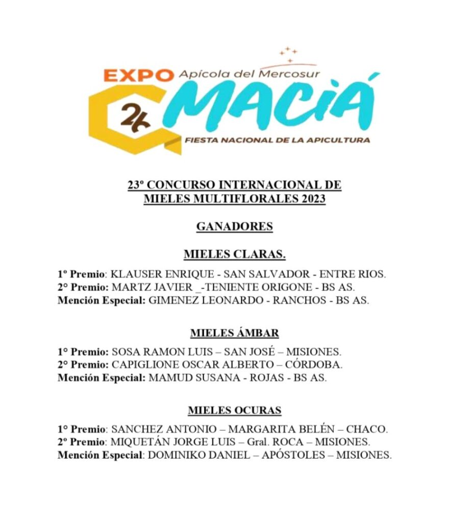 Misiones fue merecedora de 3 premios por la calidad de su producto: Ramón Luis Sosa de la localidad de Apóstoles fue el ganador del 1° puesto en la categoría de mieles ámbar. En tanto, en la categoría de mieles oscuras el 2° puesto fue para el productor Jorge Miquetán de Gobernador Roca y el 3° puesto para Daniel Dominio de la localidad de Apóstoles.
