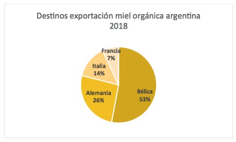 La miel orgánica que se produce en Argentina se exporta actualmente a países de la Unión Europea como Alemania, Países Bajos, Bélgica, Italia, entre otros y destina al mercado interno el 17, 89% de lo producido. En 2018, se registró un incremento del 75% en el número de colmenas bajo seguimiento respecto al año anterior, superando las 33 mil colmenas. Las mismas se localizaron principalmente en las provincias de Chaco (37%), Santa Fe (16%) y San Luis (12%).