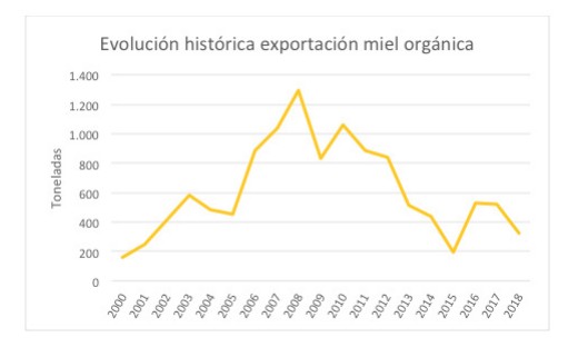 La evolución histórica de exportaciones de miel orgánica argentina muestra un incremento desde el año 2000 hasta 2008, alcanzando el valor máximo que superó las 1.200 toneladas, para luego comenzar a decrecer, llegando a un valor mínimo de 200 toneladas en 2015.