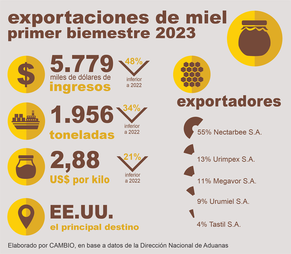 En comparación con el mismo período de 2022, se registró una disminución del 34% en el volumen de exportaciones y del 48% en los ingresos generados. En 2022, Uruguay exportó un total de 3.000.411 kilogramos de miel, generando ingresos por un valor total de 11.072.164 dólares, siendo Estados Unidos también el principal destino.